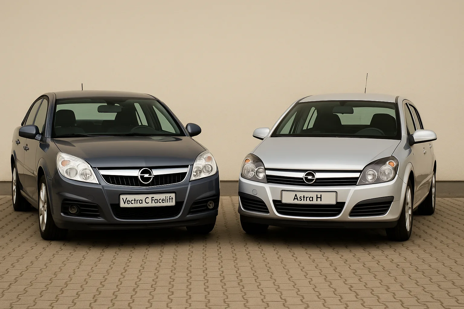 Many car enthusiasts have noticed a strong visual connection between Opel models from the early 2000s. A perfect example is the Opel Vectra C facelift (2005–2008) and the Opel Astra H (2004–2009). Although they belong to different classes – the Vectra being a mid-size sedan and the Astra a compact hatchback – both clearly share the same Opel design DNA.