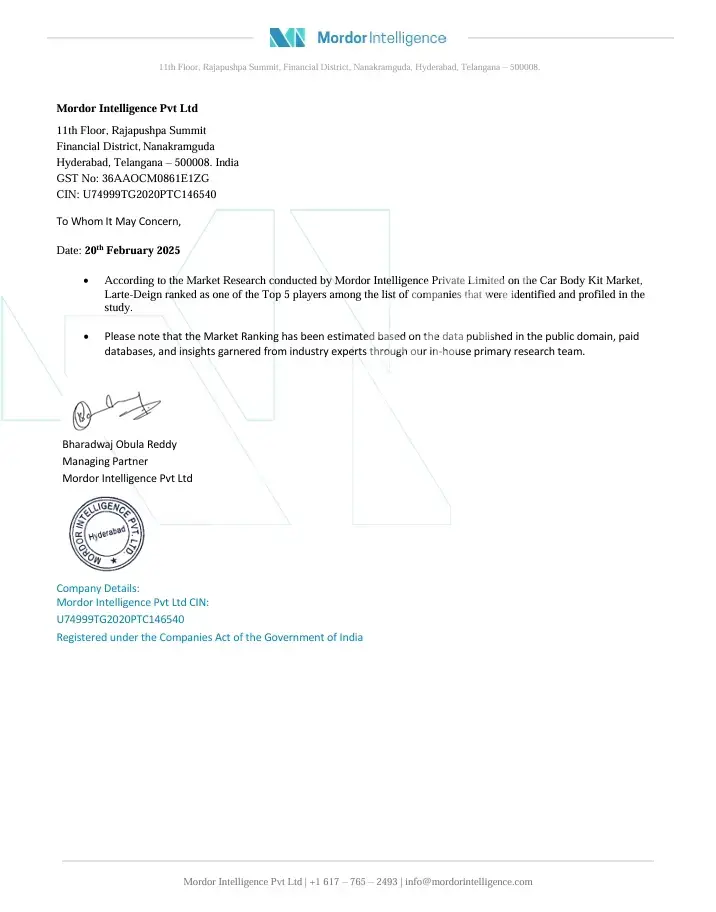 🚗 Larte Design, un nume de referință în segmentul de tuning auto premium, a fost inclusă în top 5 al celor mai bune companii de tuning din lume, conform Mordor Intelligence – una dintre cele mai prestigioase agenții de analiză specializate în cercetarea industriei globale.