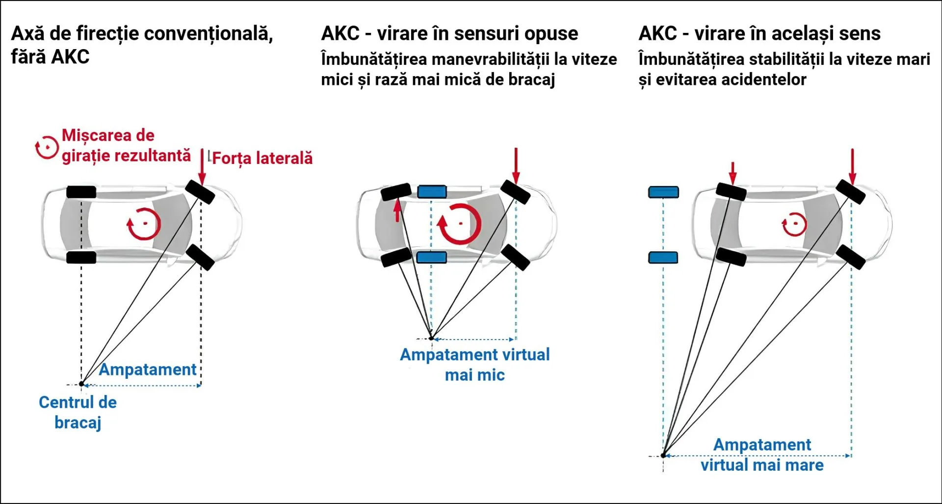 Sistemul AKC modifică unghiul de convergență al roților din spate, astfel încât acestea pot contribui activ la direcția mașinii, nu doar să o urmeze. În funcție de viteză și situație, roțile din spate se pot roti: